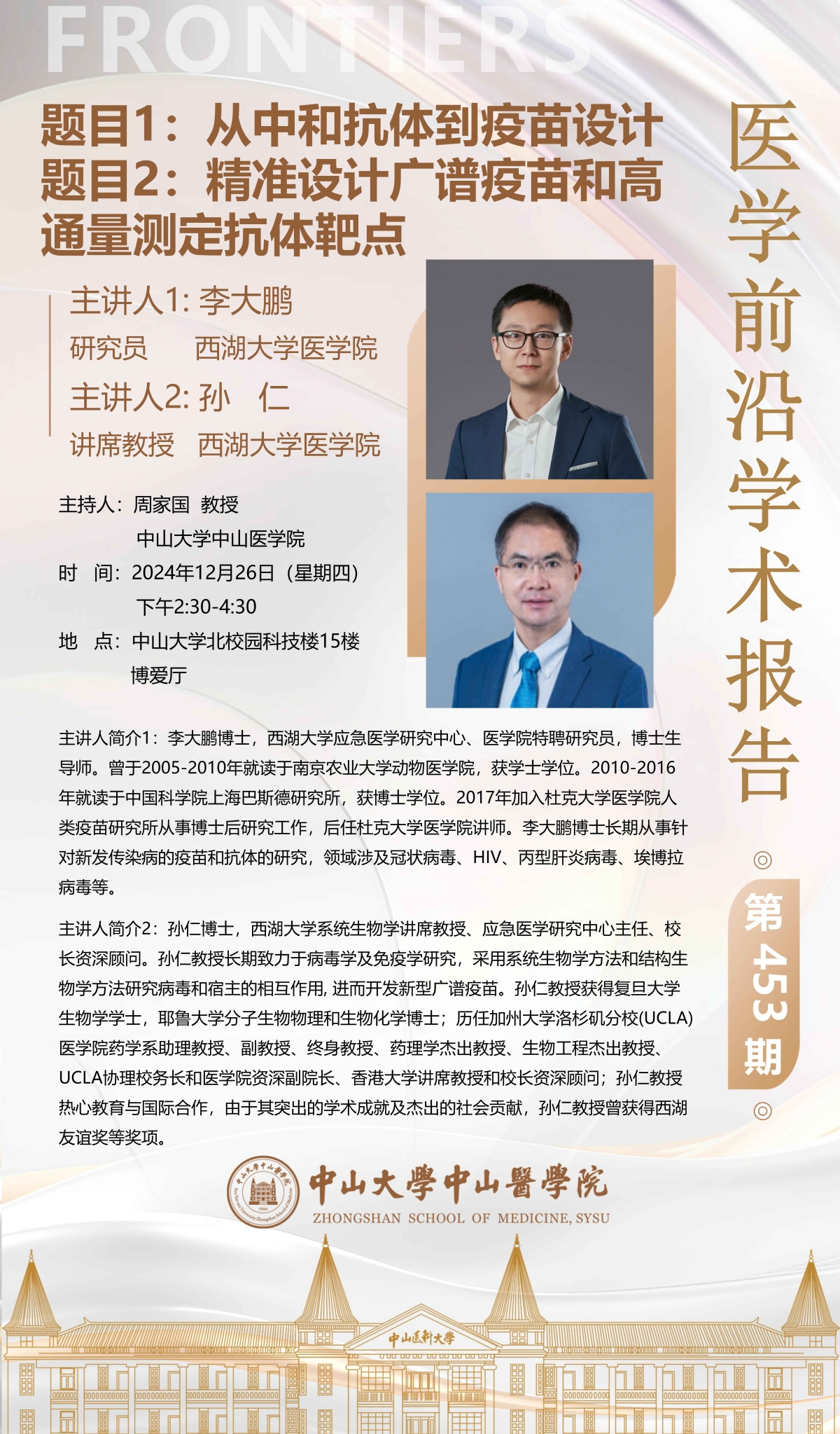 导航痕迹 首页 科学研究 学术讲座 医学前沿学术报告第453期 科学研究 科研通知 学术讲座 科研平台 办理指引 医学前沿学术报告第453期 题目1:从中和抗体到疫苗设计;题目2:精准设计广谱疫苗和高通量测定抗体靶点 发布人:何军芳 发布日期:2024-12-27