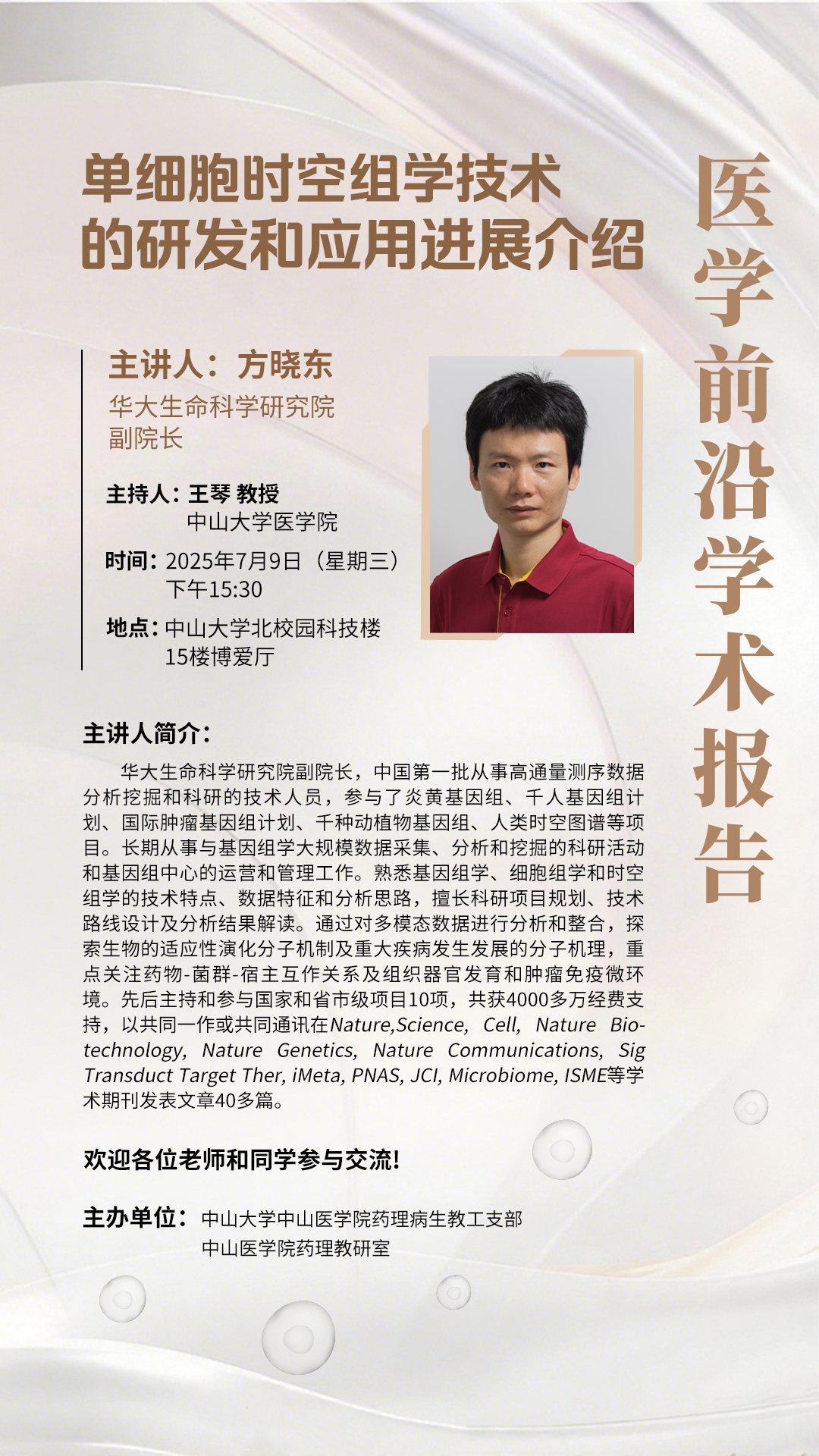 导航痕迹 首页 科学研究 学术讲座 医学前沿学术报告 科学研究 科研通知 学术讲座 科研平台 办理指引 医学前沿学术报告 单细胞时空组学技术的研发和应用进展介绍 发布人:张玉琦 发布日期:2025-06-30