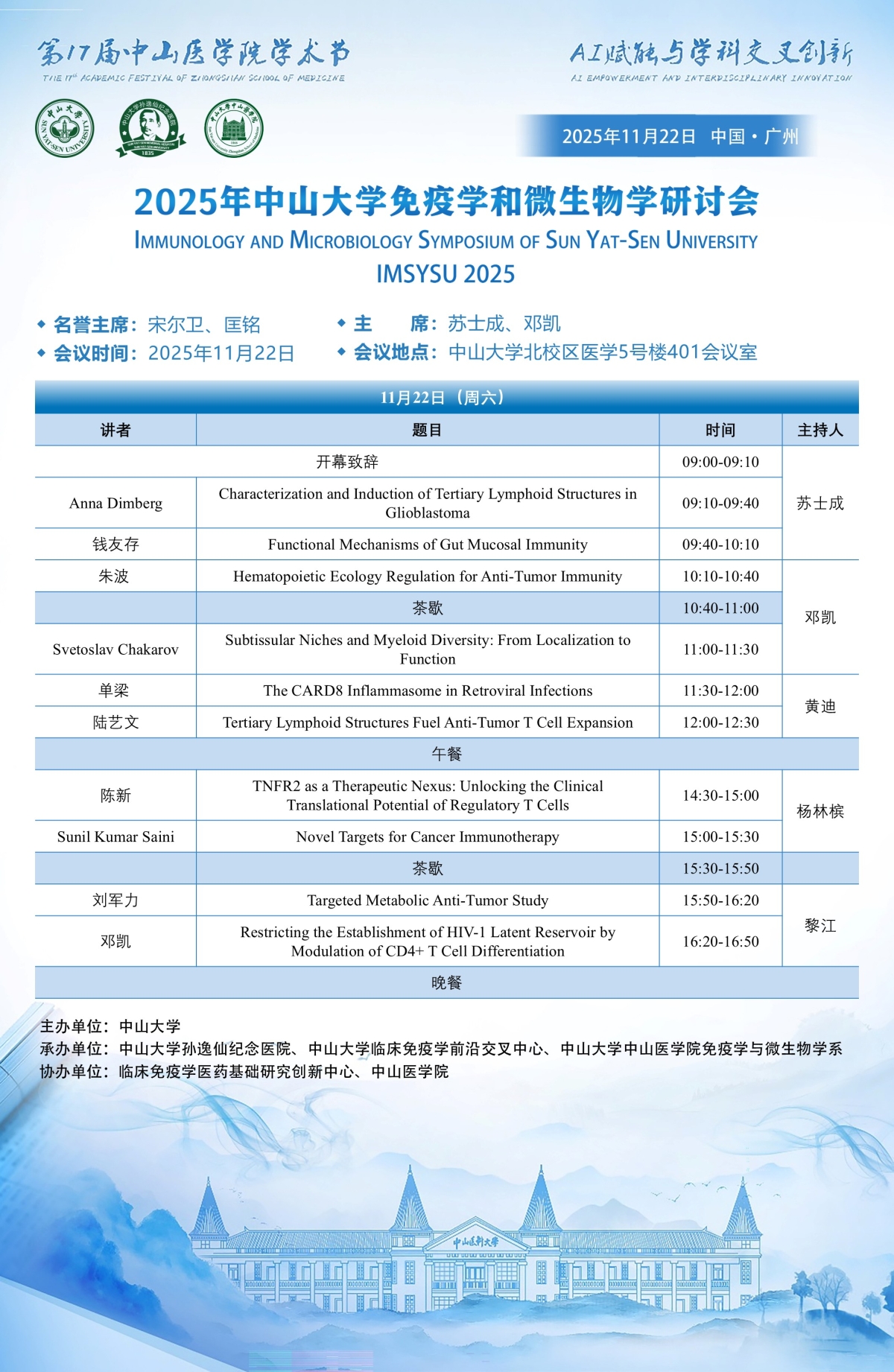 导航痕迹 首页 科学研究 学术讲座 2025年william威廉英国免疫学与微生物学研讨会(IMSYSU 2025) 科学研究 科研通知 学术讲座 科研平台 办理指引 2025年william威廉英国免疫学与微生物学研讨会(IMSYSU 2025) 发布人:张玉琦 发布日期:2025-11-20
