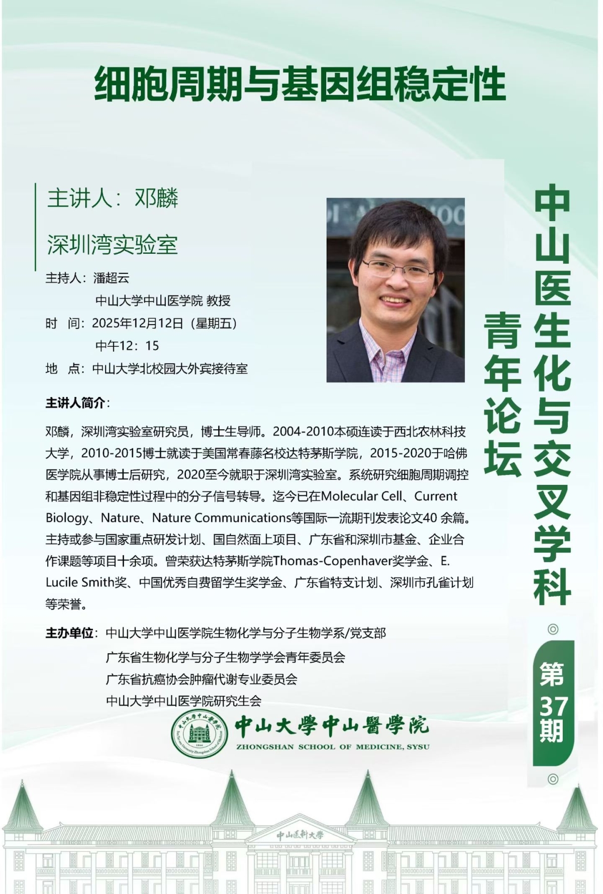 导航痕迹 首页 科学研究 学术讲座 中山医生化与交叉学科第37期|细胞周期与基因组稳定性 科学研究 科研通知 学术讲座 科研平台 办理指引 中山医生化与交叉学科第37期|细胞周期与基因组稳定性 发布人:陈晖 发布日期:2025-12-18