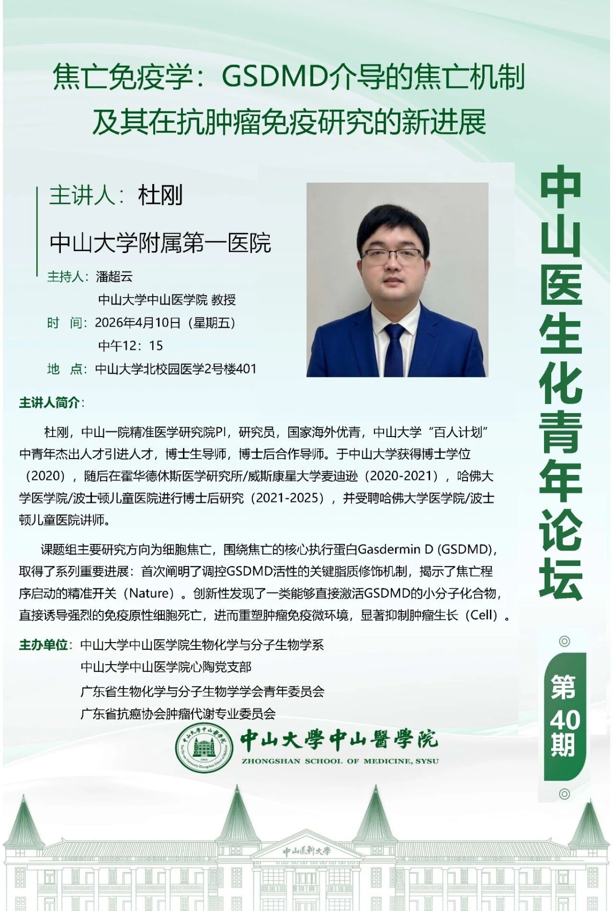 导航痕迹 首页 科学研究 学术讲座 中山医生化青年论坛第40期 科学研究 科研通知 学术讲座 科研平台 办理指引 中山医生化青年论坛第40期 焦亡免疫学:GSDMD介导的焦亡机制及其在抗肿瘤免疫研究的新进展 发布人:张玉琦 发布日期:2026-04-09