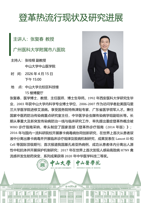 导航痕迹 首页 科学研究 学术讲座 登革热流行现状及研究进展 科学研究 科研通知 学术讲座 科研平台 办理指引 登革热流行现状及研究进展 登革热流行现状及研究进展 发布人:张玉琦 发布日期:2026-04-09
