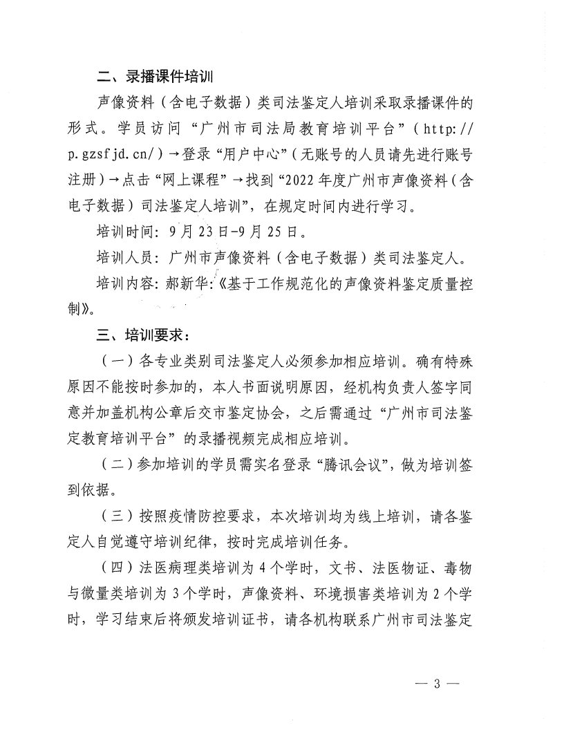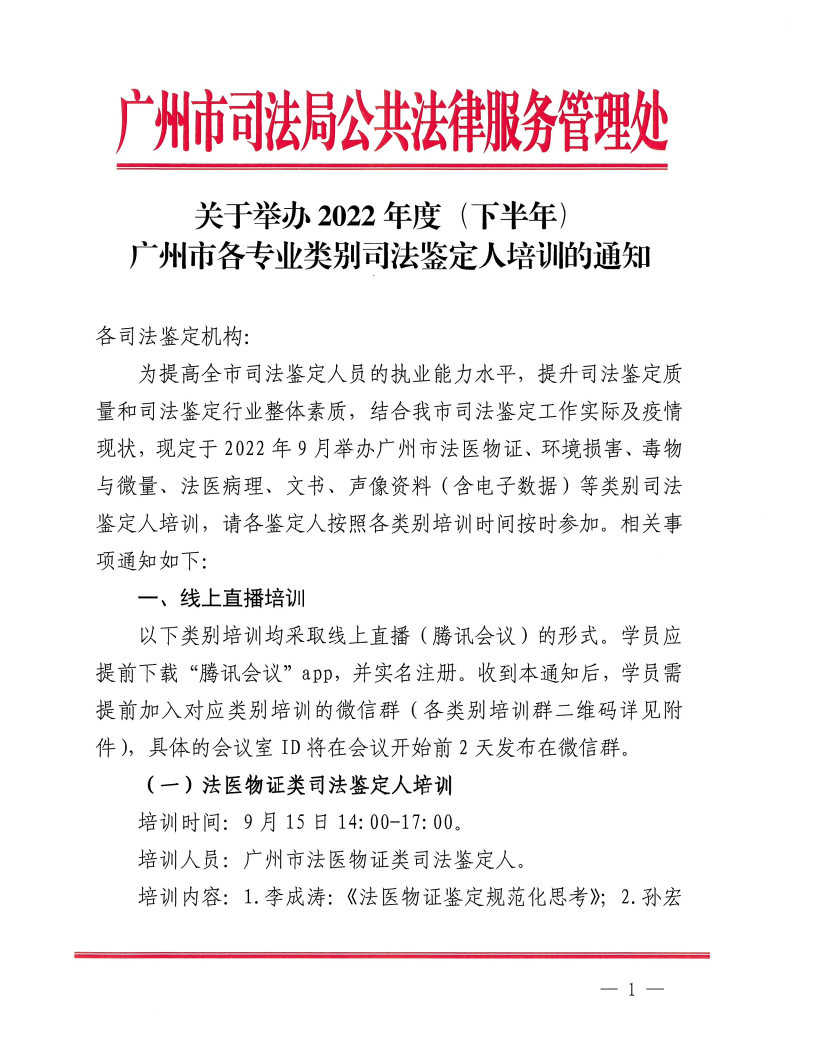 导航痕迹 william威廉英国法医鉴定中心 会议培训 关于举办2022年度(下半年)广州市各专业类别司法鉴定人培训的通知 扫描此二维码分享 关于举办2022年度(下半年)广州市各专业类别司法鉴定人培训的通知 发布人:王碧玉 发布日期:2022-09-09