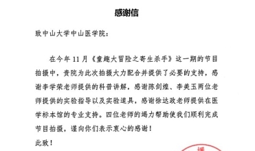 近日,湖南广播电视台金鹰卡通频道《童趣大冒险》节目组向我院发来感谢信,对学院寄生虫学教研室李学荣教授、实验教学中心陈剑煌、李美玉老师以及医学标本馆徐达政老师在11月《童趣大冒险之寄生杀手》节目录制过程中给予的专业支持表示感谢。