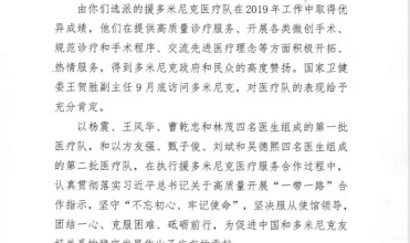 近日, 中华人民共和国驻多米尼克大使馆向我院基础医学病理生理学教研室临床副主任杨震副教授发来感谢信,对杨震副教授所在援多米尼克医疗队在2019年工作中取得的优异成绩表示感谢。