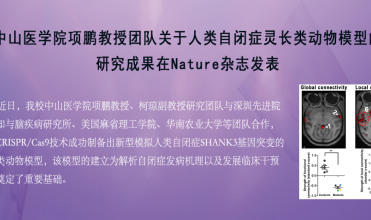 我院项鹏教授、柯琼副教授研究团队与深圳先进院脑认知与脑疾病研究所、美国麻省理工学院、华南农业大学等团队合作,应用CRISPR/Cas9 技术成功制备出新型模拟人类自闭症SHANK3基因突变的灵长类动物模型,并获得基因突变后代,首次在灵长类动物重现了人类自闭症谱系障碍(Phelan-McDermid综合征)的临床症状:突变猴表现出睡眠障碍,运动缺陷和重复刻板行为增加,以及社交和学习障碍。功能磁共振成像的数据分析揭示了大脑局部和全局连接模式的改变,指示神经环路异常。