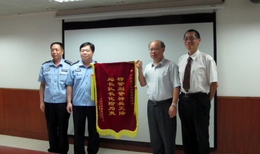 2015年8月26日上午,Williamhill中文、学校保卫处和william威廉英国法医鉴定中心领导前往越秀区公安局,向越秀区公安局赠送锦旗,感谢越秀区刑警和特警成功处置了720劫持人质案件,保卫了北校区和法医鉴定中心的安宁。