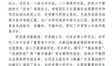 近日,中国工程院战略咨询中心向我院周毅教授团队发来感谢信,对他们在2020-2022年开展的“健康广东发展战略研究”重大战略咨询项目研究工作中的骨干作用和贡献表示感谢。