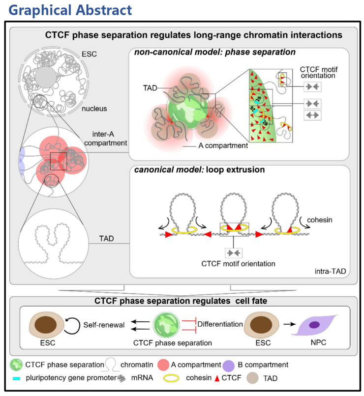 They further demonstrated that CTCF phase separation is involved in the regulation of embryonic stem cell (ESC) pluripotency. CTCF phase separation is seemingly abundant in ESCs, and decreased in differentiated cells. In ESCs, disrupting CTCF phase separation via RYBP deficiency down-regulates a majority of genes that are adjacent to the anchors of inter-A compartment interactions, and the down-regulated genes are enriched in cell proliferation terms. Disruption of CTCF phase separation significantly impaired the proliferation ability of ESCs, while induction of CTCF phase separation in RYBP-deficient cells restored their self-renewal ability. And induced CTCF phase separation inhibits the differentiation of ESCs to NPCs. Therefore, CTCF phase separation maintains embryonic stem cell self-renewal, and inhibits their differentiation to neural progenitor cells.