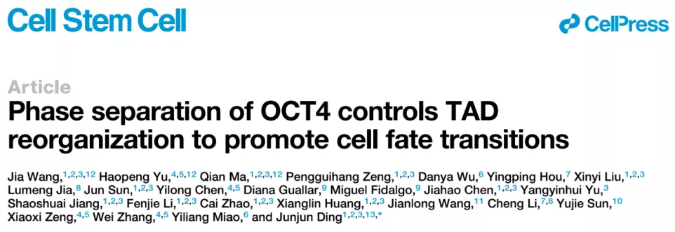 On 25 May 2021, the work of Professor Ding Junjun's team entitled "Phase separation of OCT4 controls TAD reorganization to promote cell fate transitions" is published in Cell Stem Cell, which for the first time illuminates that phase separation promotes cell fate transitions via regulating higher-order chromatin 3D architectures.