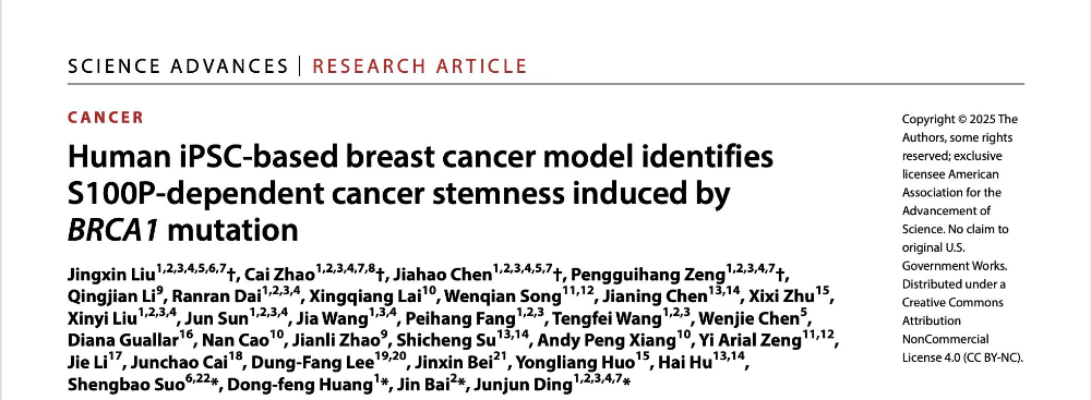 三阴性乳腺癌(TNBC)的异质性及缺乏靶向治疗选择,使其在乳腺癌中仍是最具挑战性的亚型之一。BRCA1突变与TNBC密切相关,但其如何驱动肿瘤起始、特别是与乳腺癌细胞干性相关的机制,长期缺乏人源水平上的模型与直接证据。近期,丁俊军等团队在 Science Advances 报道了一项技术与机制双重突破的研究,首次基于人iPSC构建BRCA1突变相关的TNBC模型,并揭示了S100P介导的细胞干性调控新机制。