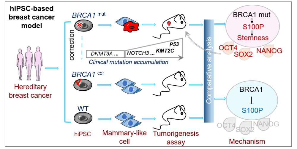 该研究的创新性主要体现在三个方面:首先,作者基于胚胎乳腺发育原理,设计出首个高效的人iPS细胞向功能性乳腺上皮细胞定向分化方案。该方法获得的乳腺细胞在小鼠体内能成功进行乳腺重建,成功突破了既往研究中iPSC难以分化出具有成熟功能的乳腺细胞的瓶颈;其次,研究团队利用携带BRCA1致病突变的患者家系iPS细胞,结合CRISPR/Cas9修复该突变作为对照组,建立了人源性乳腺癌模型。这是首个基于人iPS细胞的乳腺癌体外模拟体系,该模型能够模拟从胚胎干细胞到三阴性乳腺癌的演进过程,精准重现了BRCA1突变相关乳腺癌的转录组特征、基因组不稳定性及突变积累规律,为研究遗传性乳腺癌早期演化提供了研究平台;最后,通过分析癌变发生动态过程中的数据,研究首次揭示BRCA1缺失后下游早期激活的致癌因子S100P是驱动肿瘤干细胞形成的关键分子。