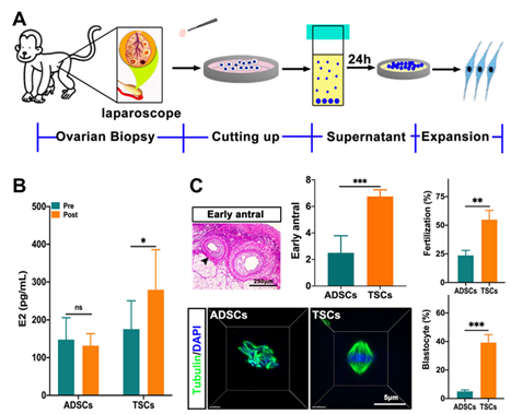 A,应用腹腔镜微创获取微量灵长类动物卵巢组织分离获得TSCs;B,自体移植TSCs提高雌激素水平;C,自体移植TSCs促进卵泡发育、改善卵子质量、提高受精效率。